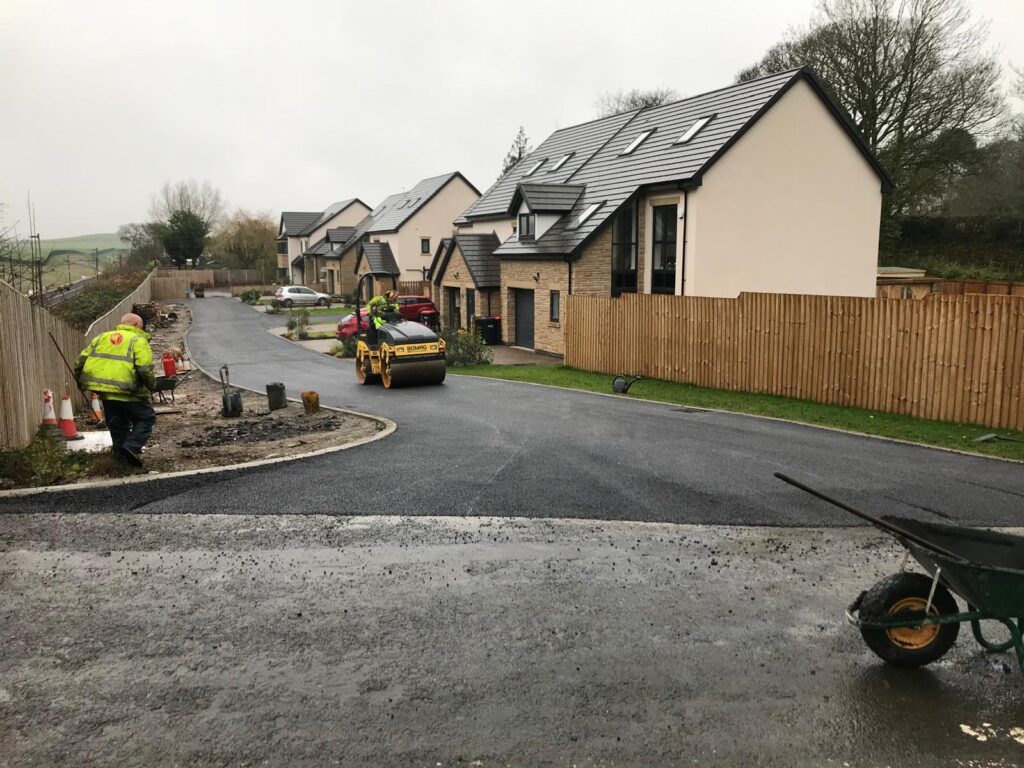 Roads are machine-laid in multiple layers of robust tarmacadam, typically using 10mm or 14mm Stone Mastic Asphalt (SMA) for strength and long life under heavy traffic.